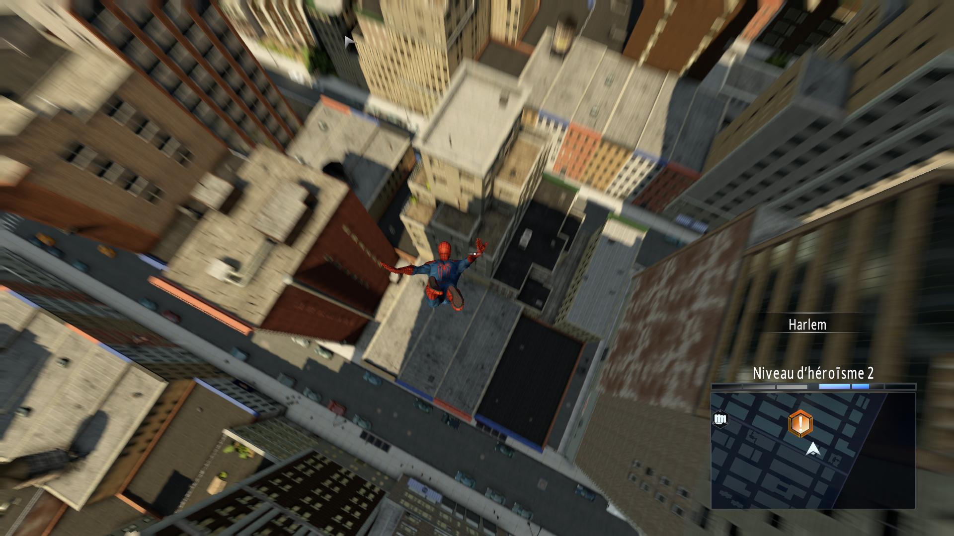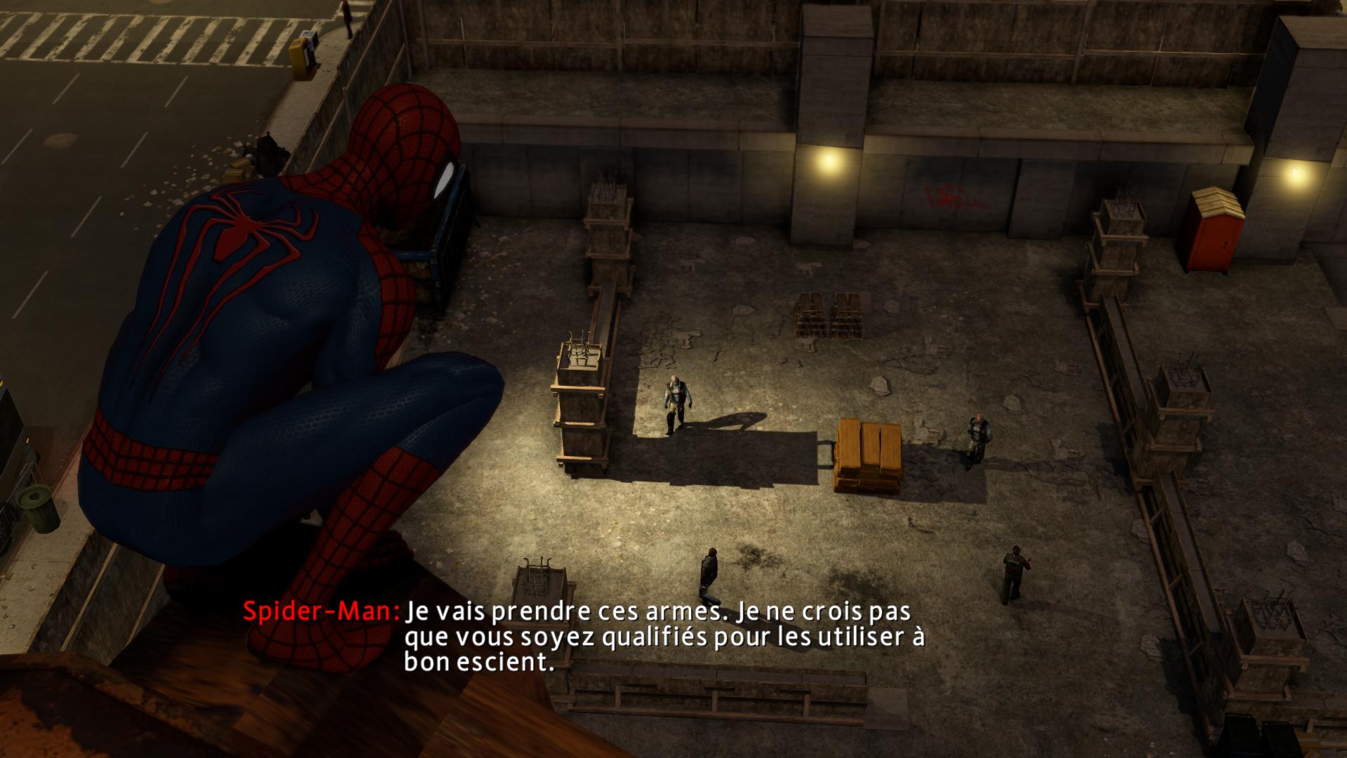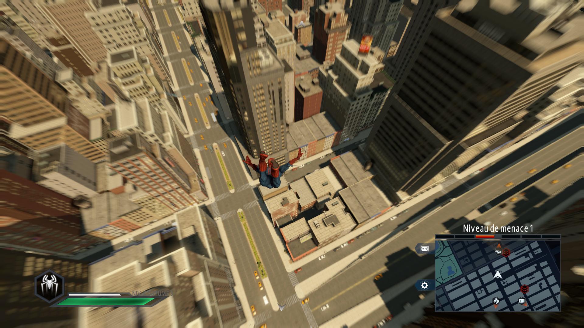 Pour les graphismes, on va commencer à taper. C’est moche. VRAIMENT moche. A part le costume de Spiderman, que nous avons régulièrement en gros plan et pour lequel un bel effort de texture et de modélisation a été fait, les personnages sont mal détourés, les visages étant les seuls parties de l’anatomie humaine ayant retenu l’attention des graphistes. Les textures sont globalement ignobles, les mains par exemple sont atrocement modélisées. Les décors eux, ont des textures assez proches de Skyrim (on sait ce que ça veut dire…) et reste très sobres dans leur design, mais il faut quand même reconnaître que quand notre Araignée monte au sommet d’un gratte-ciel, voir toute la ville de haut avant d’y plonger, ça rend vraiment bien.