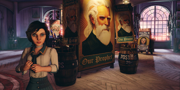 Le troisième épisode de Bioshock lui se situe à Columbia, la ville aérienne. Votre personnage principal, Booker DeWitt est également arrivé malgré lui jusqu’en haut et possède une mémoire perforée de souvenirs et de flashs qu’il ne comprend pas lui-même. Plein de petites références aux deux premiers Bioshock du nom sont insérés dans ce jeu (comme quoi il ne se suffit pas à lui-même…). Mais bref, passons. La seule phrase dont Booker se souvient est “retrouvez la fille et nous effacerons la dette”. C’est à la poursuite d’Elizabeth que vous vous mettez en chemin, perdu dans un monde où l’effigie du souverain est déifiée et où la révolte fait rage. Vous vous prendrez très vite de passion (oui, vous, en tant que joueur) pour votre nouveau compagnon, tout à fait charmante !