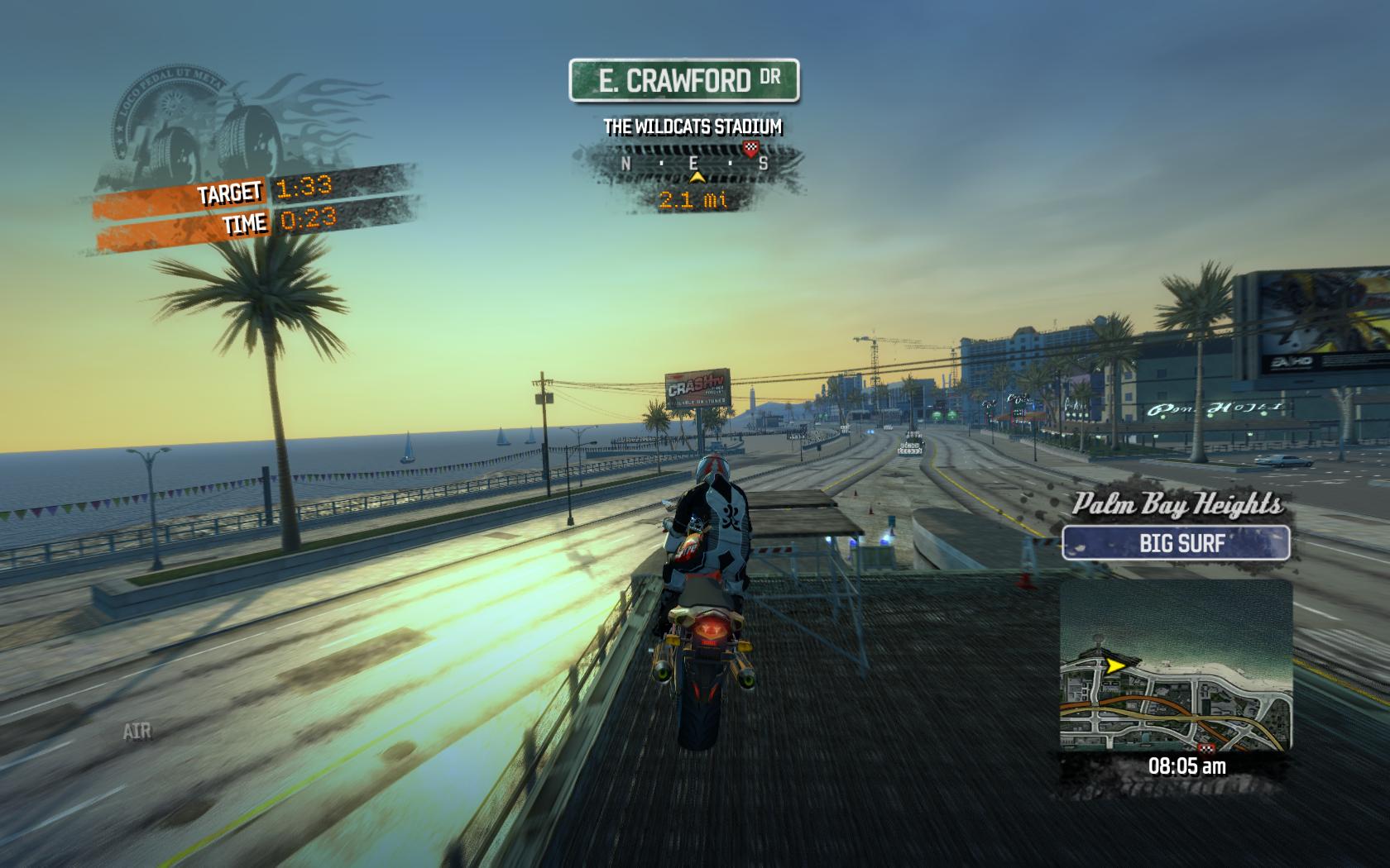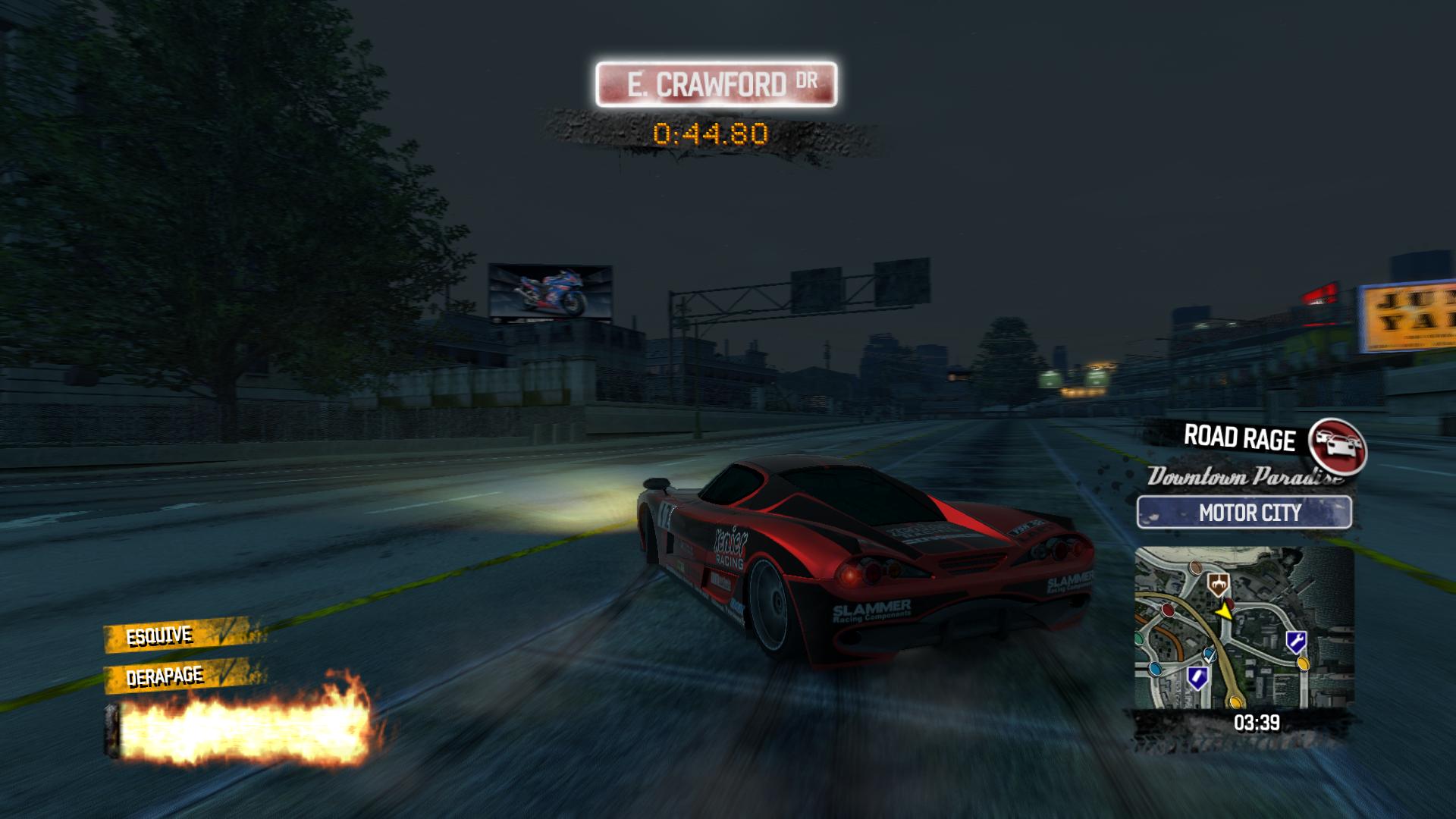 Les autres jeux vous pénalisent quand vous mangez un obstacle ou une autre voiture, vous perdez du temps, c’est pas professionnel, haha quel amateur. Mais pas ici. Les crashs sont mis en valeur d’une façon tellement spectaculaire que c’est un délice de voir le métal se tordre, le verre se briser et votre ruine de véhicule déformer tout le paysage. Pas d’os brisé, pas de chair brûlée, rien : dans Burnout Paradise, les humains ne sont pas représentés, personne dans les rues ni au volant des bagnoles. Si ça peut faire un peu vide, ça se comprend ! L’un des modes de jeu classiques chez Burnout, c’est le Roadrage. On vous file une voiture, un carrefour, beaucoup de trafic… Et l’objectif de réaliser autant de dégâts que possible, avec score détaillé à la fin, comprenant des bonus de diversité, des combos.