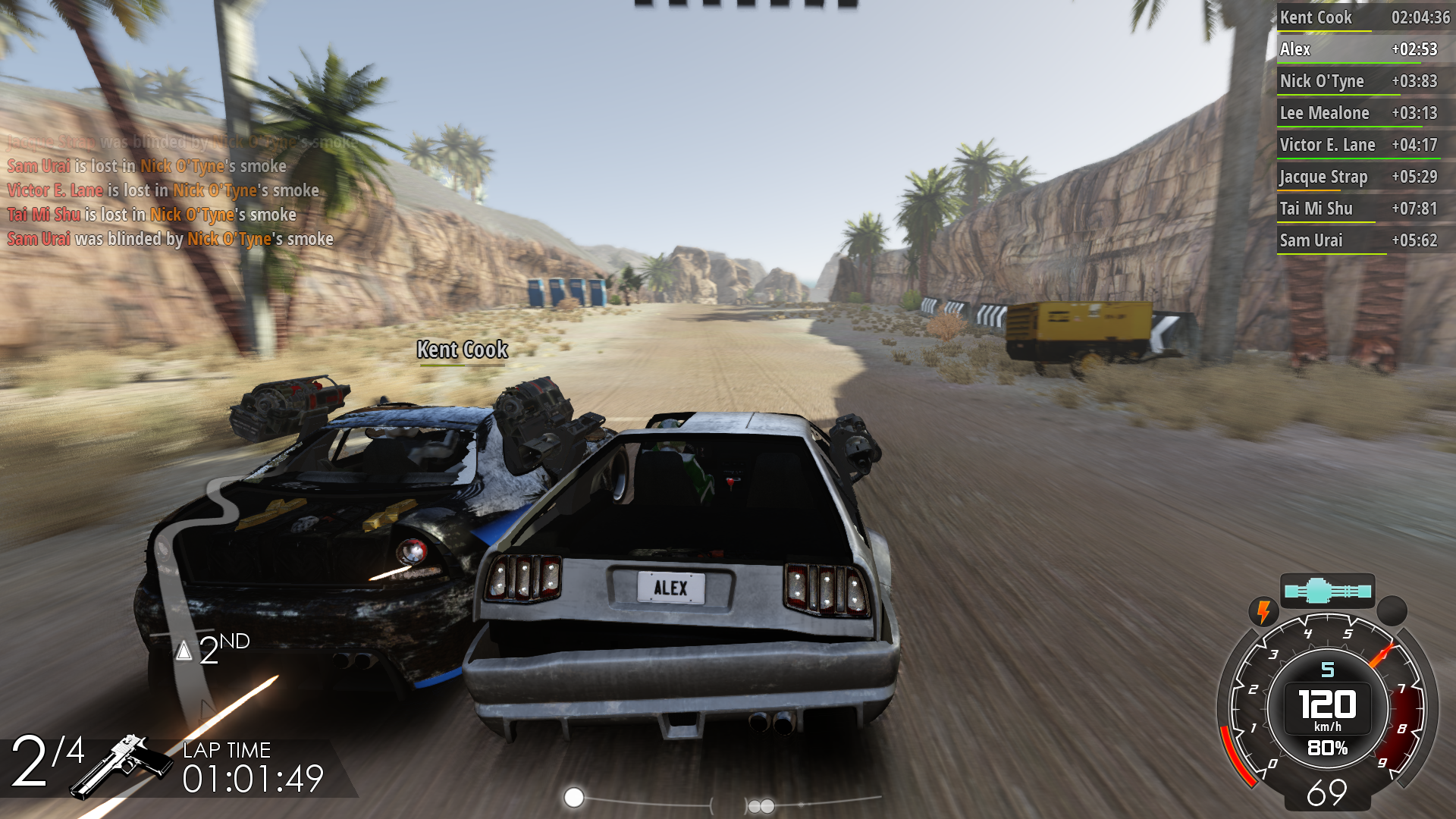 Alors laissez moi vous présenter Gaz Guzzlers Extreme. Tout droit sorti du petit studio Gamepires, celui-ci vous entraîne dans des courses endiablées à bord de voitures survitaminées donc le premier atout n’est pas le moteur (qui n’est que second) mais bel et bien le calibre des munitions que vous embarquez ! A vous de vous hisser à la tête du championnat au travers de 3 types de courses : classic, battle et last man standing ainsi qu’un mode arène.