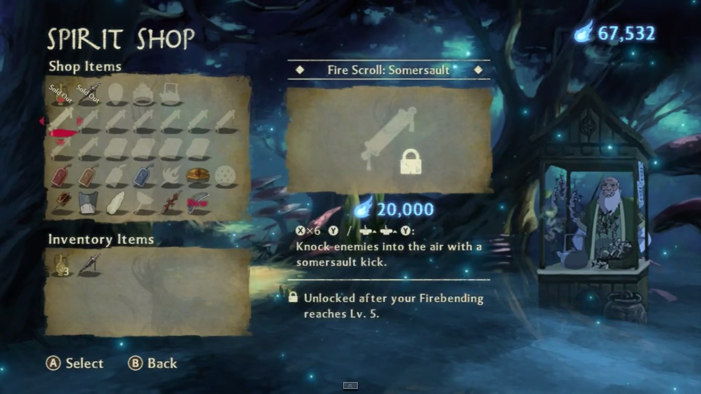 Maintenant parlons de la boutique de Iroh. Dans celle-ci Iroh vous offrira de nombreux objets à acheter, ces objets seront de deux natures. Soit ils seront passifs et vous donneront un ascendant certain sur vos adversaires, par exempte le “Cristal de Chi” qui vous permettra d’être à puissance maximale en permanence. Soit ils seront cumulables et utilisables telles les “potions de soin” etc. Il vous sera aussi possible d’obtenir de nouveaux combos. Pour acheter tout cela vous devrez éliminer les ennemis au fur et a mesure des niveaux afin d’obtenir de la “matière spirituelle”, monnaie du jeu. Par conséquent la boutique est extrêmement importante et il vous faudra acquérir des objets pour faciliter votre avancée dans les chapitres.