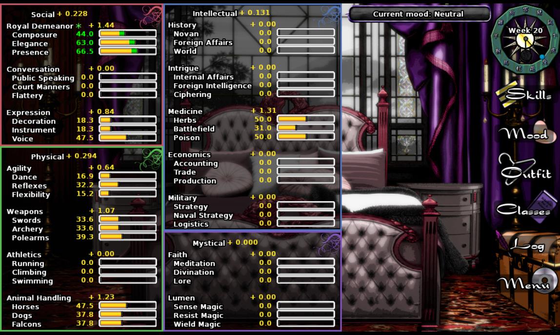 Les points gagnés dans les compétences sus-citées influent sur la réaction d’Elodie aux évènements imprévus. Si vous ne lui avez pas fait étudier le maintien royal, elle fera probablement une gaffe lors d’un rassemblement de nobles, de même que si vous ne l’avez pas éduquée dans la divination, elle échouera à reconnaître les présages les plus évidents.