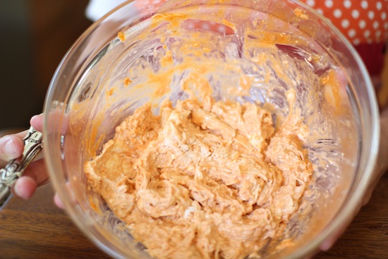 3 – Placez la charpie ainsi obtenue dans un bol, avec les ingrédients suivants – fromage râpé, sauce, fromage crémeux, noix de muscade, oignon en poudre.