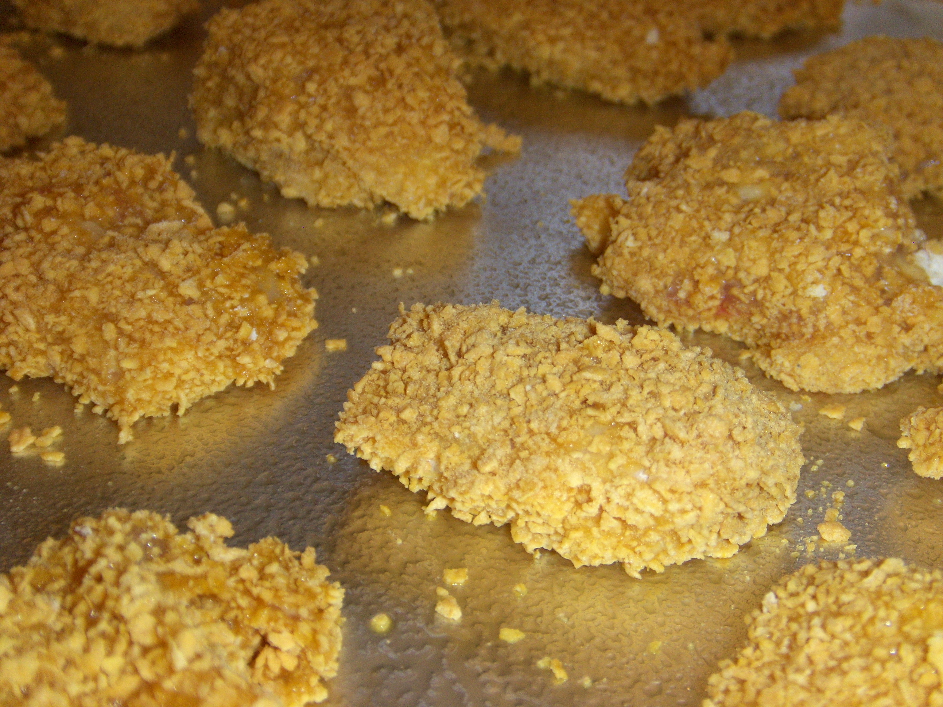 – Des corn-flakes sans sucre que vous aurez concassées. On peut y substituer de la chapelure dorée pour un résultat un peu plus léger, mais l’expérience bouchées panées de poulet épicé revues et corrigées par Louvellan requiert des corn-flakes. Je ferai une partie sur la LAN diététique, mais pas pour cette fois.