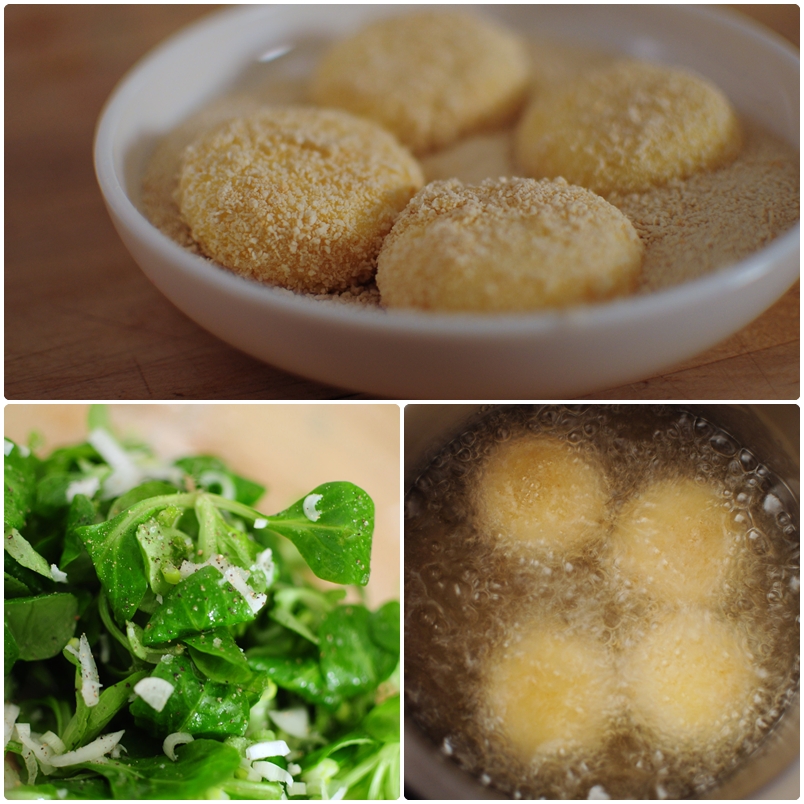 Roulez-les dans la farine, puis dans l’oeuf, puis dans la chapelure. Refaites un passage dans l’oeuf, et à nouveau dans la chapelure, et laissez reposer.