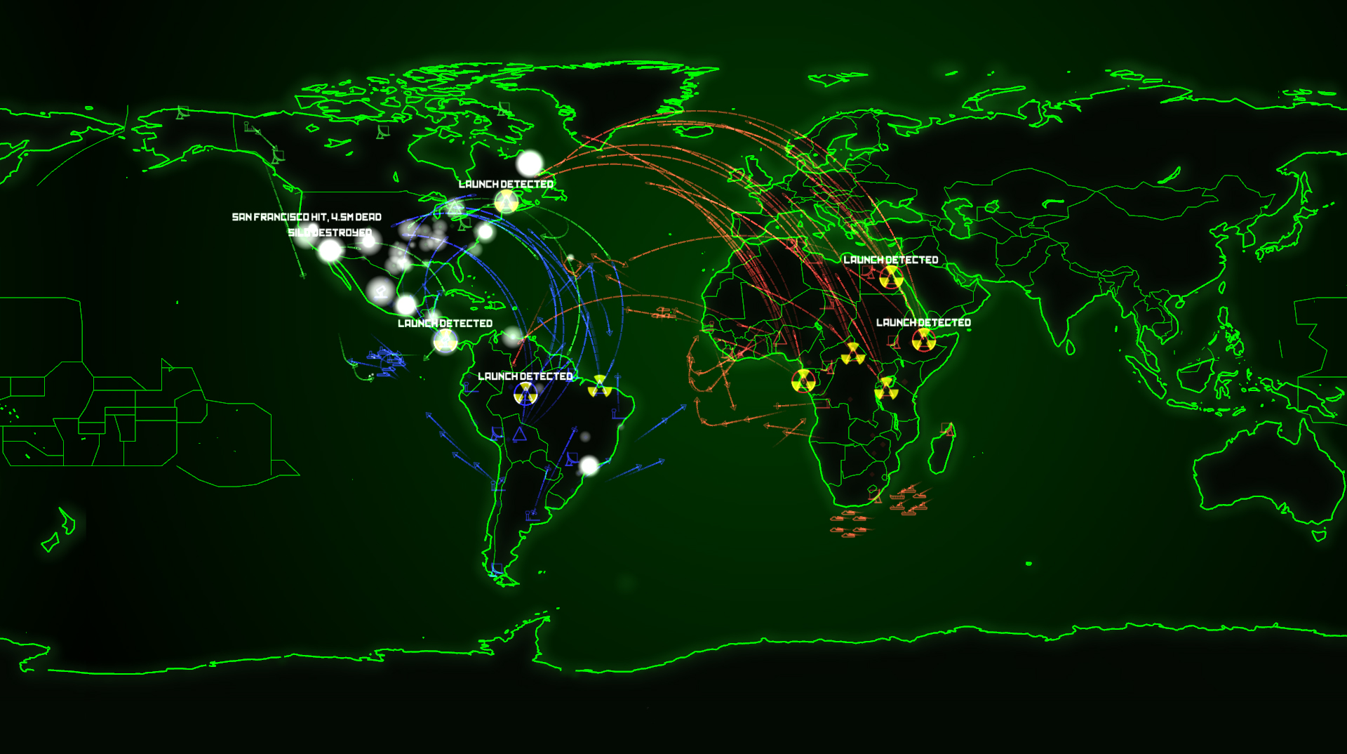 Et pourtant, oui, on s’amuse. Le jeu propose une esthétique particulièrement épurée, et du même coup très marquante. Il n’y a là aucune fantaisie : le planisphère est représenté façon table d’opérations ou écran de contrôle mural. Cette visualisation assez simpliste se retrouve dans les unités et les bâtiments : tout est dessiné et représenté, vos flottes ne sont pas des bateaux miniature mais des icônes. D’un côté, cela contribue à cette atmosphère clinique et épurée du titre, qui distance volontairement le joueur du ravage nucléaire dont il est responsable, et d’un autre côté, rend l’action très accessible et lisible en un simple coup d’œil. Les screenshots qui accompagnent cet article vous permettront de mieux appréhender l’aspect assez unique du titre.
