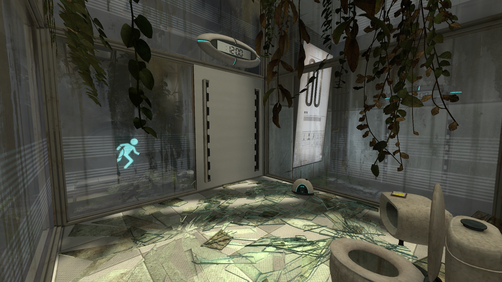 Chell est de retour à Aperture Science, coincée dans une chambre vide à contempler de l’art pour stimuler son activité cérébrale. Comment ? Pourquoi ? Aucune idée. Mais c’est un laboratoire en décrépitude que vous découvrez, aux infrastructures détruites par la végétation. GlaDOS est morte, vous vous souvenez ? Il n’y avait donc plus personne pour entretenir le centre.